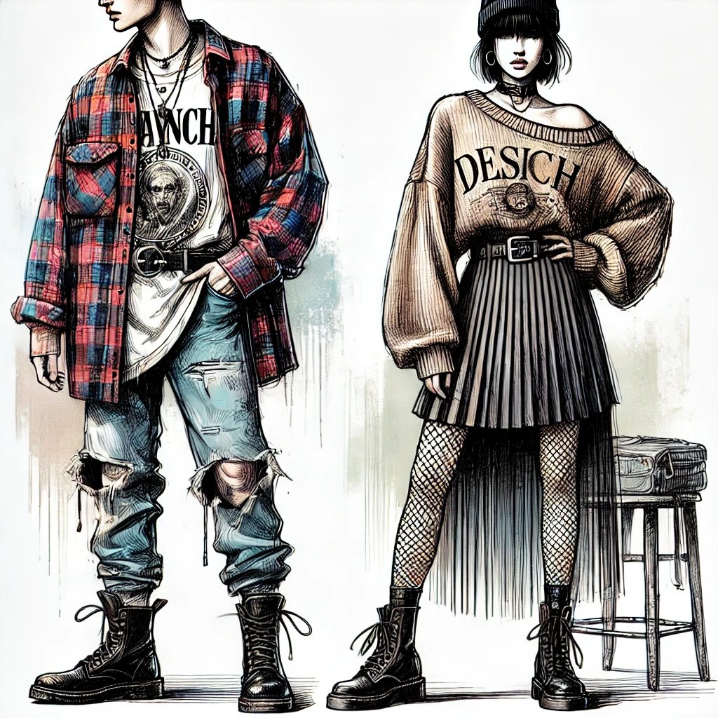 주요 아이템으로는 체크무늬 플란넬 셔츠, 찢어진 청바지, 빈티지 티셔츠, 전투 부츠, 낡은 스니커즈, 오버사이즈 니트 등이 있으며,