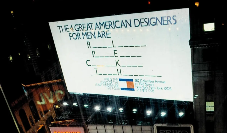 타미 힐피거의 인기를 끌어올린 중요한 마케팅 전략 중 하나는 1985년 뉴욕 타임스퀘어에 걸린 대형 광고판 캠페인입니다.