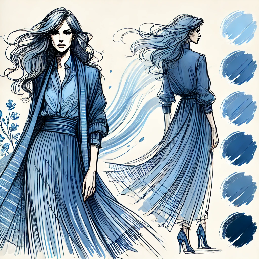 패션 디자인에서 파란색은 신뢰, 안정, 평화, 그리고 지적인 이미지를 상징합니다.
