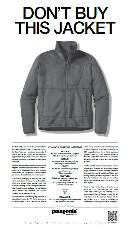 광고에는 파타고니아의 자켓 사진과 함께 “이 자켓을 사지 마세요”라는 문구가 적혀 있었는데,