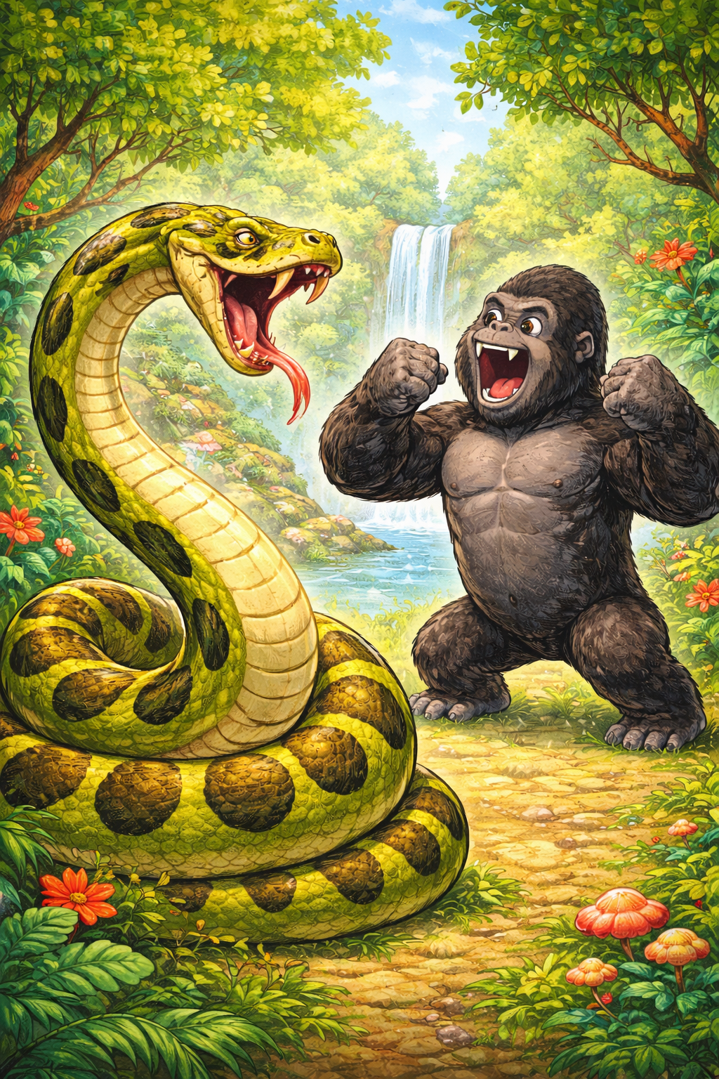 아나콘다는 무섭지만, 고릴라와의 싸움에서는 체력·지능·폭발력에서 밀립니다.